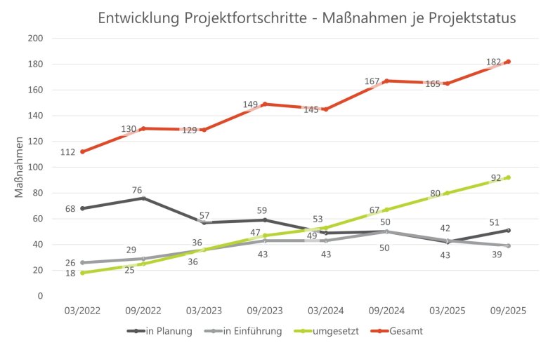 Wir haben zum 30.9.2025 die aktuellen Projektfortschritte erhoben, die in den Anlagen 4 und 6 des Kompass Verwaltungsdigitalisierung halbjährlich fortgeschrieben werden. Hier sehen Sie die Entwicklung in der Übersicht: