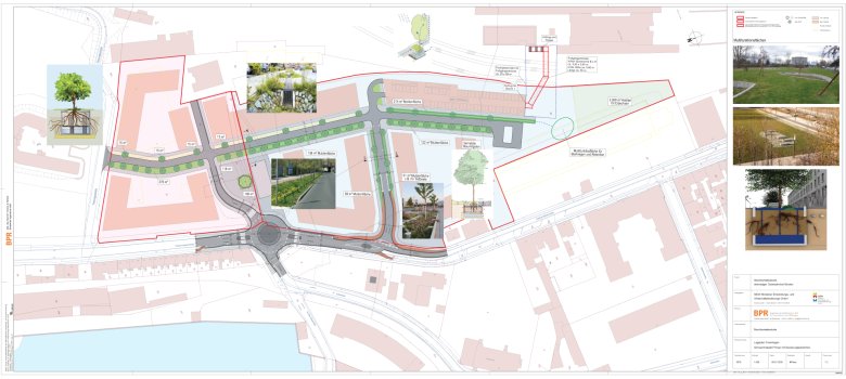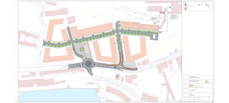 Lageplan Verkehrsanlagen (© BPR Ingenieure GmbH & Co. KG, Bremen)Die zukünftige Erschließung in das Gebiet wird über zwei neue Zufahrtsstraßen erfolgen. Innerhalb des Gewerbegebietes ist eine großzügige Nord-Süd-Achse vorgesehen, die neben einer begleitenden Grünfläche auch einen Multifunktionsstreifen vorsieht, der z. B. für Parkbuchten oder Außengastronomie genutzt werden werden kann. Zusätzlich ist im Bereich Hafenstraße / Friedrich-Wilhelm-Straße ein neuer Kreisverkehr geplant. In der Machbarkeitsstudie sind die Belange des Fahrradverkehrs berücksichtigt worden, so dass eine optimierte Radverkehrsführung vorliegt.